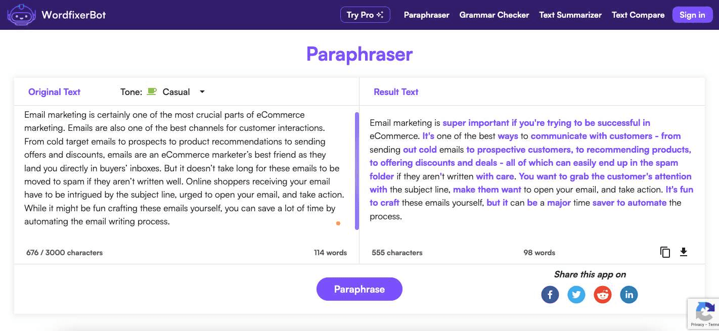 Best Used For: High-volume paraphrasing needs and quick rewording of straightforward content.