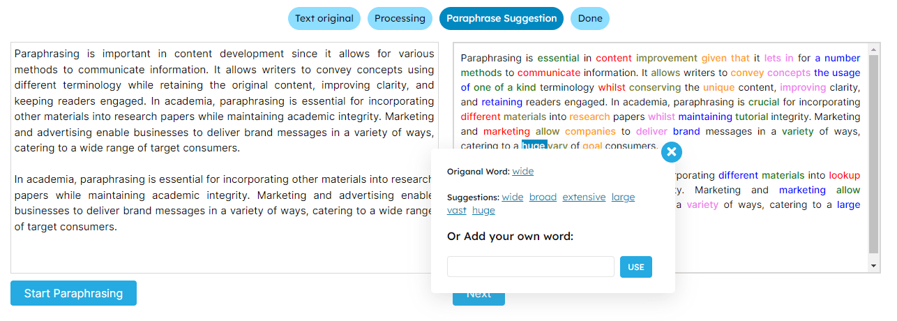 Quality paraphrasing tools offer multiple modes—from light rewording that preserves most original phrasing to complete restructuring that creates entirely new sentences with the same meaning.